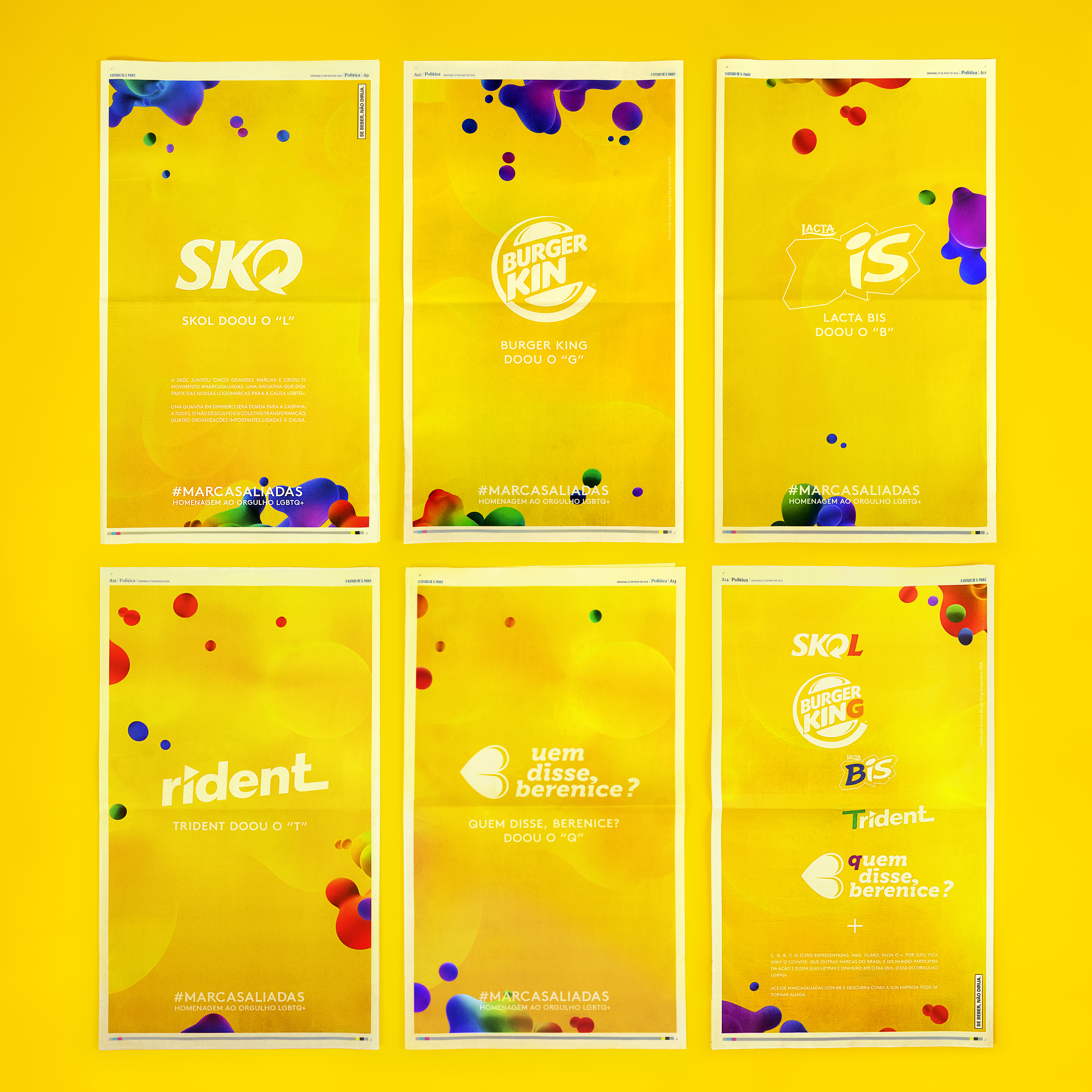 Throughout the LGBTQ + Pride month, Skol donated the “L” of its brand to the LGBTQ cause. Yes, Skol's "L" turned into Lesbian's "L". And to "start" a movement, we invited other major brands to donate "G", "B", "T", and "Q". They were: Burger King, Bis, Trident, and Quem disse Berenice. Later we opened the invitation for more brands to donate letters and join the #ALLIEDBRANDS. In all, 50 brands got in contact to join the movement, and out of 50, 11 closed the agreement, totalling 16 allied brands that, together, impacted more than 80 million people.